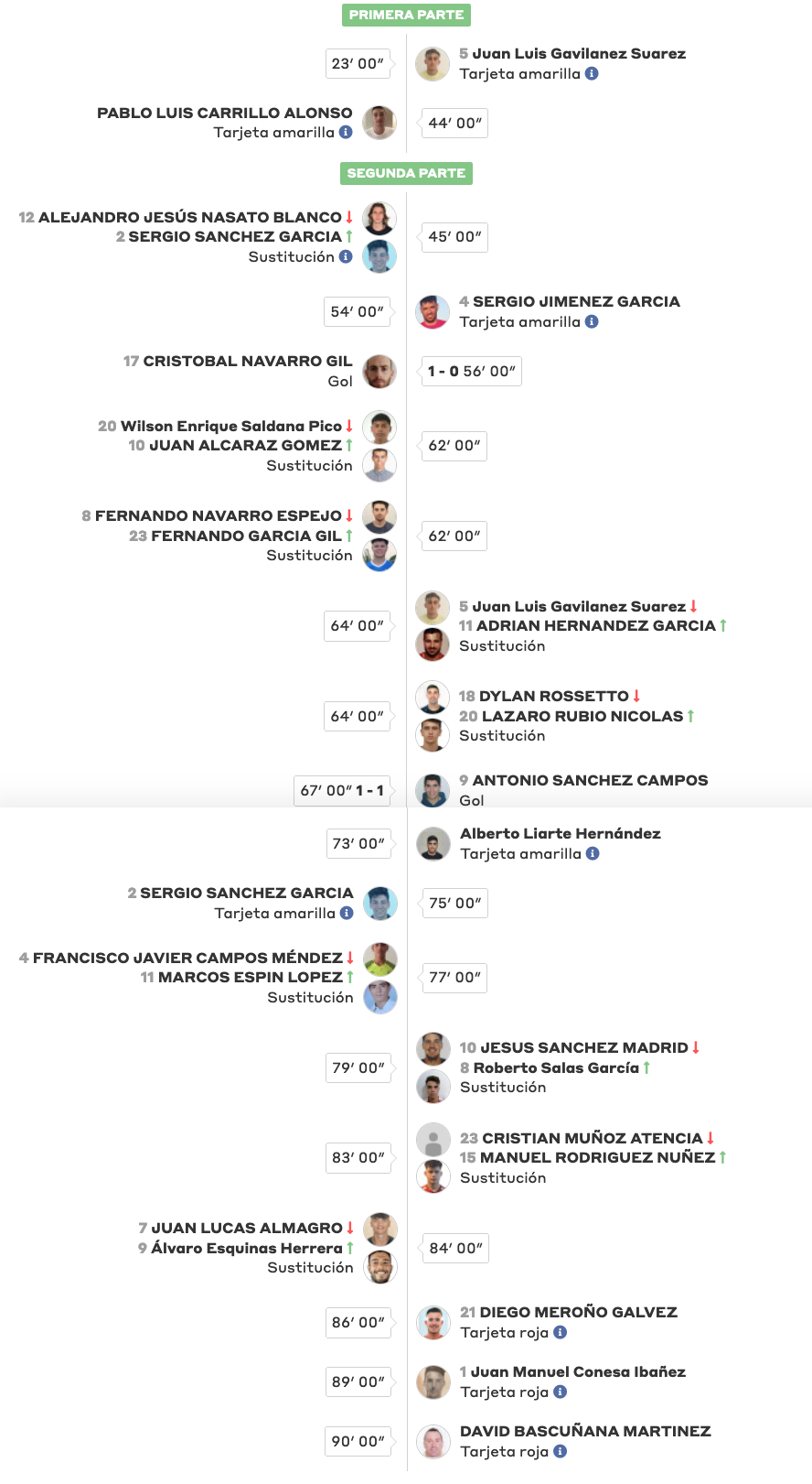 Los del noroeste y los algareños han disputado un choque bastante duro en el que ambos equipos han tenido sus ocasiones para ganar, destacando, por parte de visitantes, las que estuvieron en la cabeza de Sergio Jiménez y en las botas de Nono y de Cohete. El primero de ellos sí acertó para empatar instantes después de marcar el Muleño y ya lleva tres dianas esta temporada. El segundo, Cohete, acabó de portero tras sufrir el CD Algar dos expulsiones: Diego Meroño por una dura entrada a un rival (86') y el meta Juanma (89') en la protesta por un gol local que sería anulado. En el minuto 83 ya tenía agotado el cupo de cambios el CD Algar, con lo que Cohete se situó bajo los palos. En el minuto 90 también fue expulsado el entrenador visitante, David Bascuñana. El partido casi duró los 100 minutos.