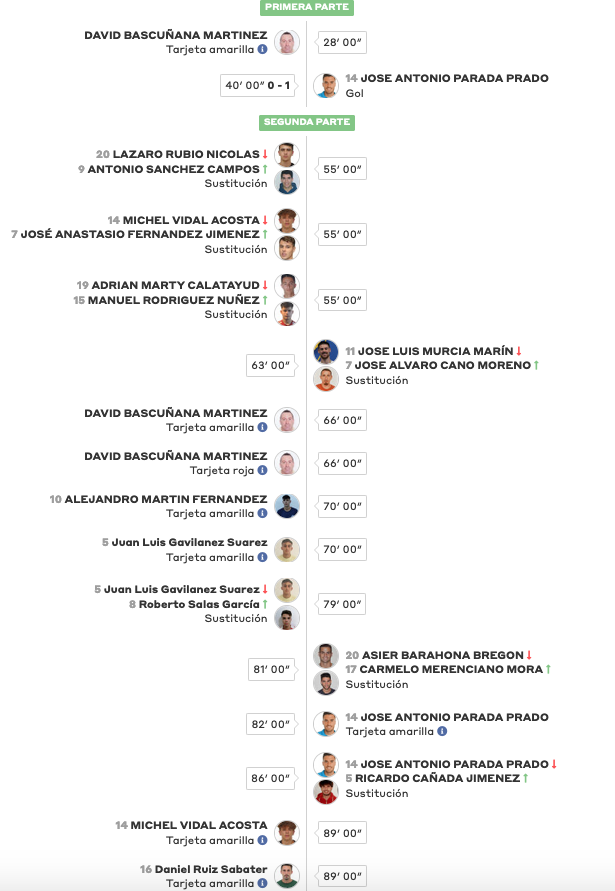 El CD Cieza también tuvieron su ocasiones de gol, pero el meta local, Alejandro, realizó un gran encuentro evitando de que el resultado solo se quedara en el 0-1 merced al gol conseguido en el minuto 41 por Parada, cuando, desde fuera del área, agarró un gran disparo que entro como un obús en la que el portería, sin que la estirada del cancerbero pudiese desviar el rumbo que llevaba el esférico.
