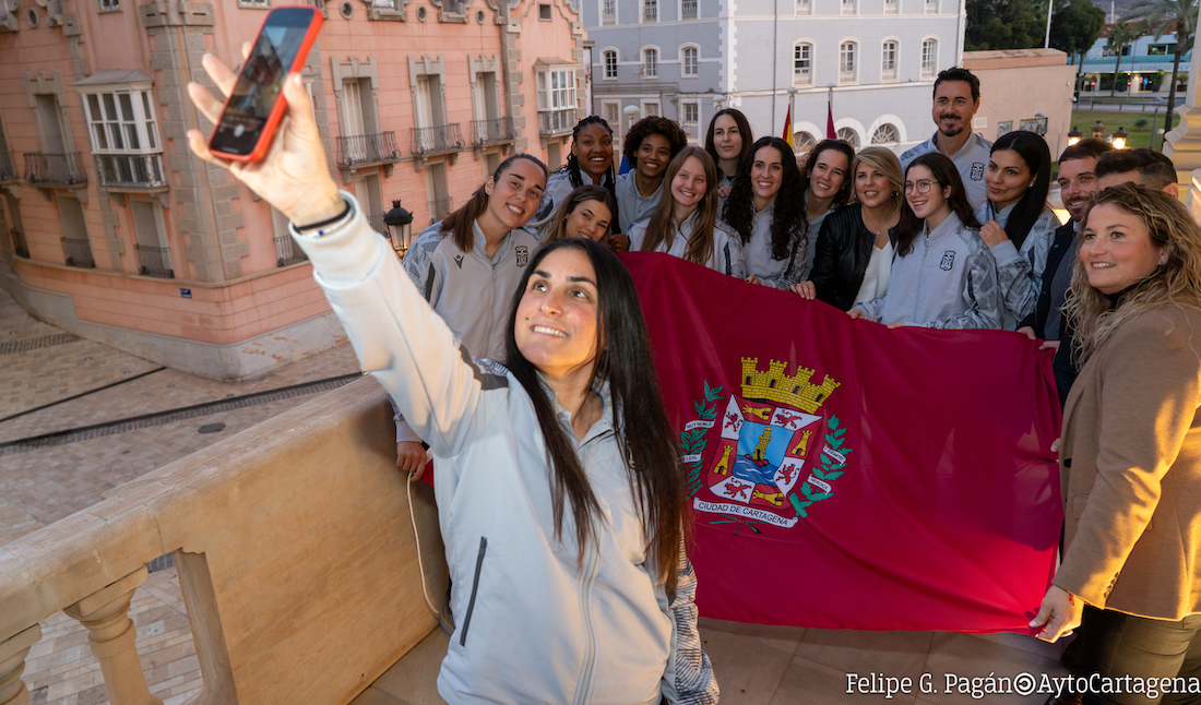 La alcaldesa ha recibido al equipo en el Salón Isaac Peral del Palacio Consistorial, y le ha hecho entrega de una bandera de Cartagena “mucho más grande para que os represente y podáis lucirla en el momento oportuno”, que será, según la alcaldesa, cuando ganen la Copa Princesa. Por eso ha bromeado con las jugadoras diciendo que “el autobús (que usó el Jimbee en la rúa por Cartagena) aún no lo hemos guardado”.