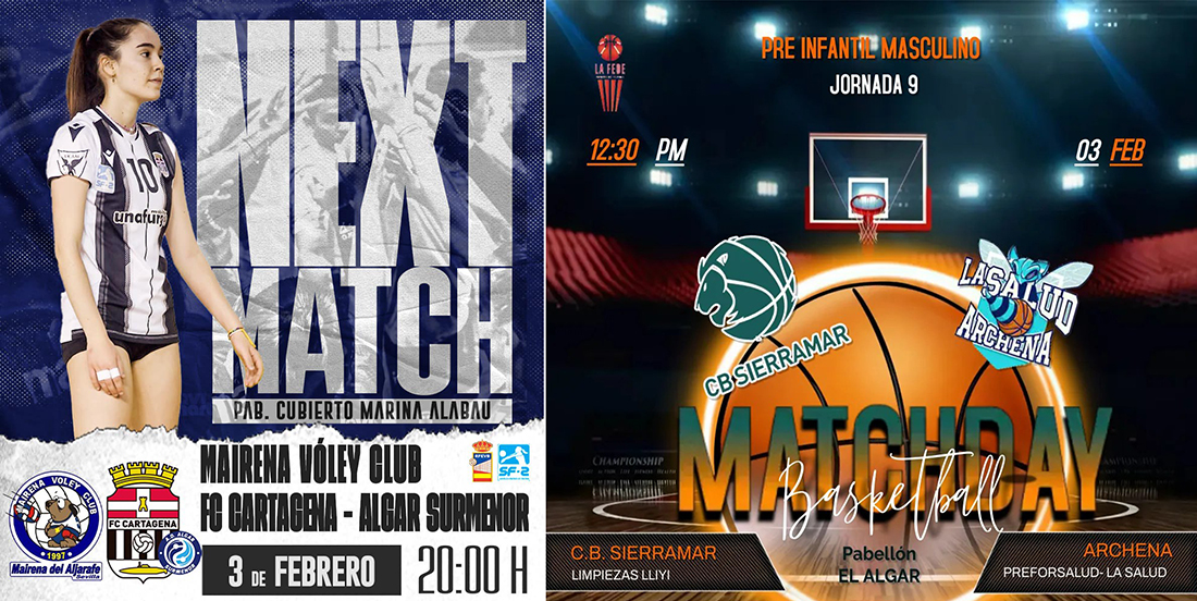 Viaja el FC Cartagena AD Algar Surmenor a tierras sevillanas ante un equipo que marcha quinta en la SF2 de voleibol y que no se lo pondrá fácil. En sus categorías de base, comienza la segunda fase para las juveniles. En fútbol, el CD Algar visita al filial del UCAM Murcia. También ofrecemos horarios de las categorías de base de fútbol y de baloncesto. Fuera del deporte, tarde de sábado (18 horas) para el bingo en el local social de Los Urrutias.
