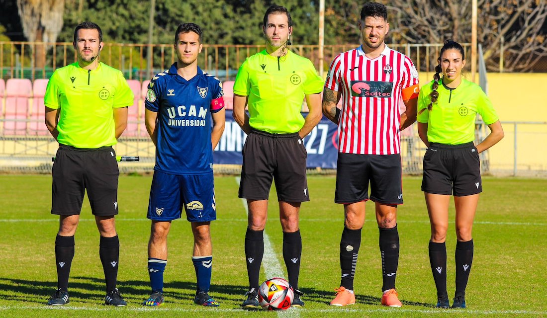 Trío arbitral con los capitanes Adrián González (UCAM) y Sergio Jiménez (CD Algar)