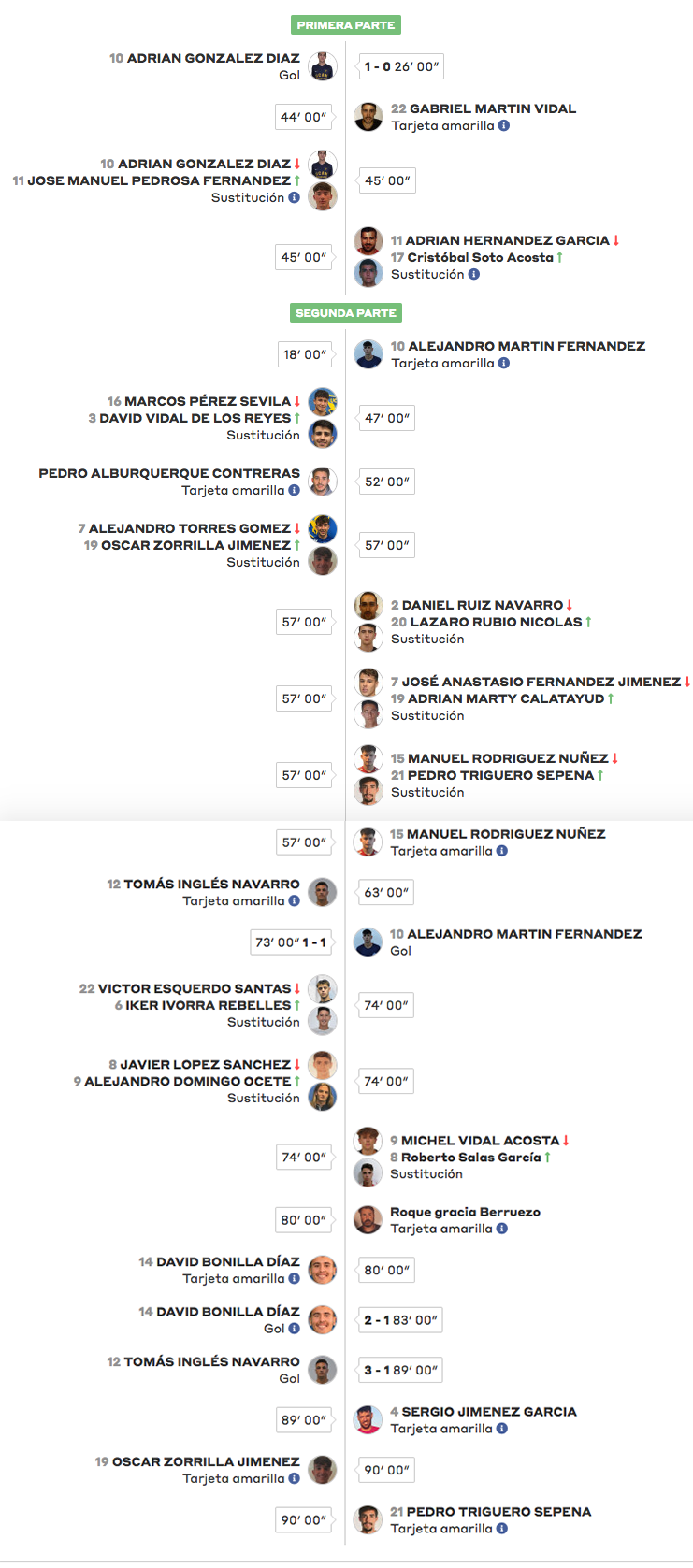 GOLES. 1-0. Minuto 26: Adrián González. 1-1. Minuto 73: Álex Cohete, entrando en el área por el lateral. 2-1. Minuto 83: Daviti, de penalti. 3-1. Minuto 90: Tomás Inglés.