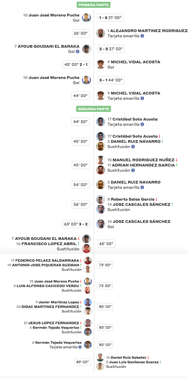 GOLES. 1-0. Minuto 22: Puche. 2-0. Minuto 27: Baraka de penalti. 2-1. Minuto 40: Míchel. 3-1. Minuto 45: Puche. 3-2. Minuto 65: Cáscales.