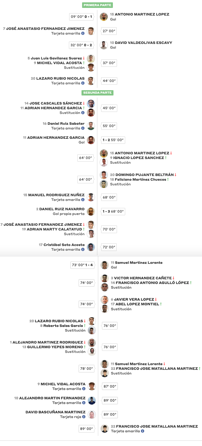 GOLES. 0-1. Minuto 9: Antonio. 0-2. Minuto 30: David Valdeolivas. 1-2. Minuto 54: Rivo. 1-3. Minuto 70: Dani Ruiz en propia meta. 1-4. Minuto 72: Samuel.