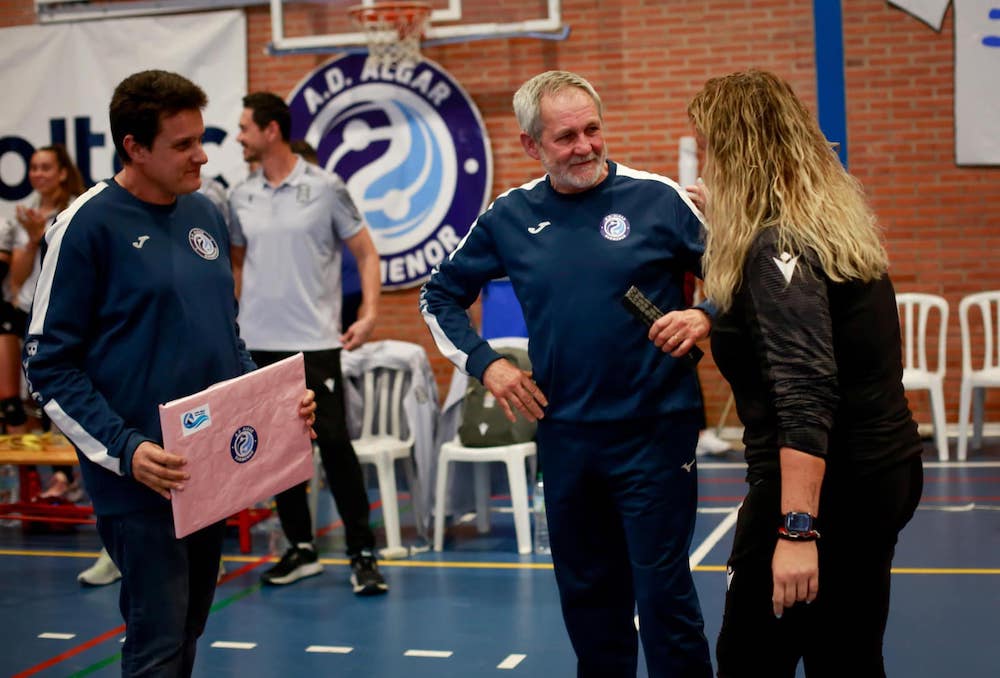 Juan Sáez Celdrán recibió en un abarrotado pabellón escolar de El Algar un homenaje coincidiendo con el partido FC Cartagena AD Algar Surmenor-Covirán de Granada como acto previo a que en breve este recinto pasará a llevar su hombre en reconocimiento a la trayectoria por el voleibol y el papel del fundador del club.