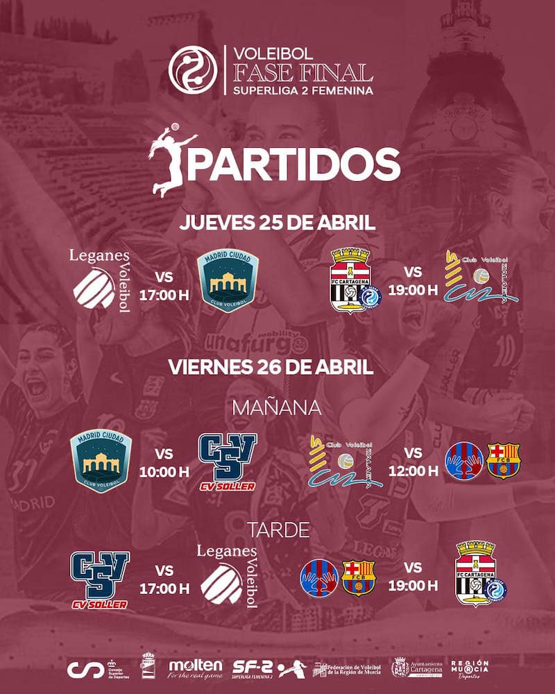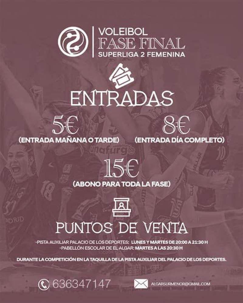 Del 25 al 28 de este mes se celebrará en el Palacio de Deportes de Cartagena la fase de ascenso de la Superliga Femenina 2 de voleibol femenino, donde el FC Cartagena-AD Algar Surmenor sueña con la proeza de volver a la SF1. Se han fijado ya los horarios y los precios, con un un abono de 15 euros para ver todos los partidos de los 6 equipos que buscan esa ansiada plaza, además de 5 euros para asistir a sesiones matinal o de tarde y de 8 para el día completo.