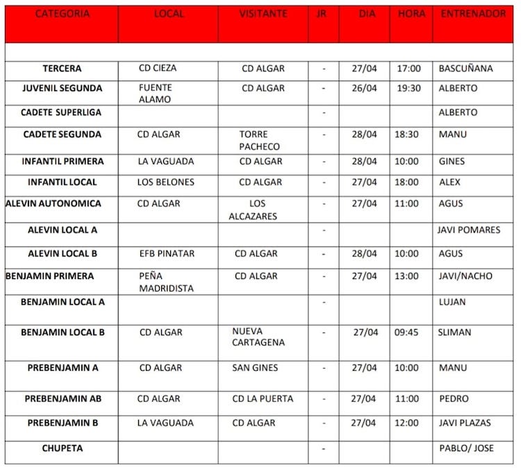 Doble propuesta en el Teatro Circo Apolo, mientras que hay fiesta en torno al baile en el centro cívico algareño y se estrena el nuevo horario de la lotería familiar en Los Urrutias. El domingo se estrena el sendero PR de la Fuente del Sapo y el CD Algar se la sigue jugando, esta vez en Cieza. Nueve equipos del Club Baloncesto Sierramar tienen partido y en voleibol lucha por el título regional las infantiles de la AD Algar Surmenor, mientras que las mayores afrontan en Cartagena los partidos decisivos para el ascenso a la élite.