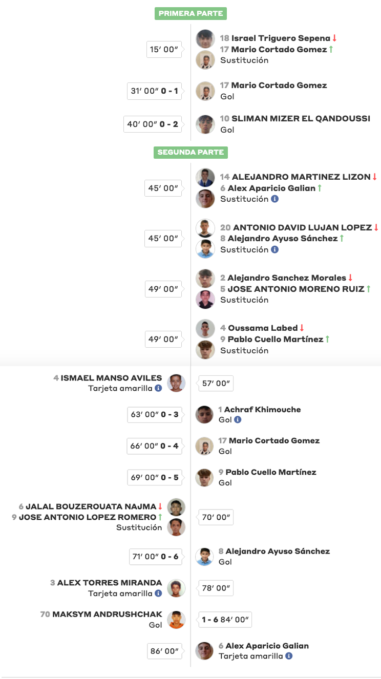 Tras una primera media hora sin goles en el estadio Pitín, Mario Cortado y Sliman Mizer marcaron antes del intermedio, ampliando la ventaja después Achraf Khimouche, Pablo Cuello, Alejandro Ayuso y otra vez Mario Cortado, quien firmó un doblete.