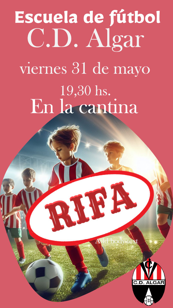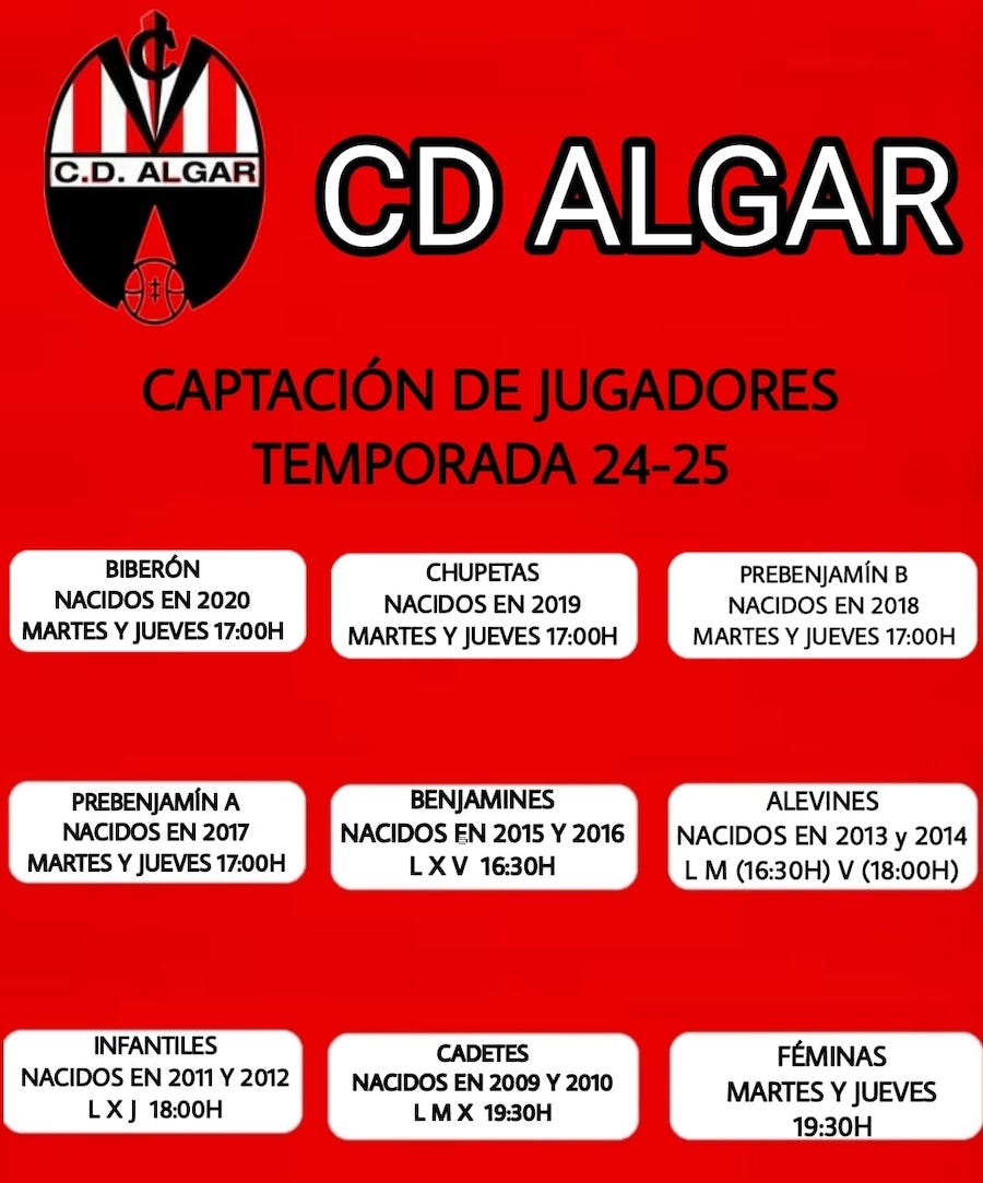 El CD Algar anuncia los días y horarios para las pruebas a chavales que quieran incorporarse a sus equipos en la temporada 2024/25. Por otro lado, en la tarde este viernes (19.30 horas) tendrá lugar una rifa en al cantina del campo de fútbol Sánchez Luengo cuyos beneficios se destinarán a la escuela de fútbol rojiblanca.