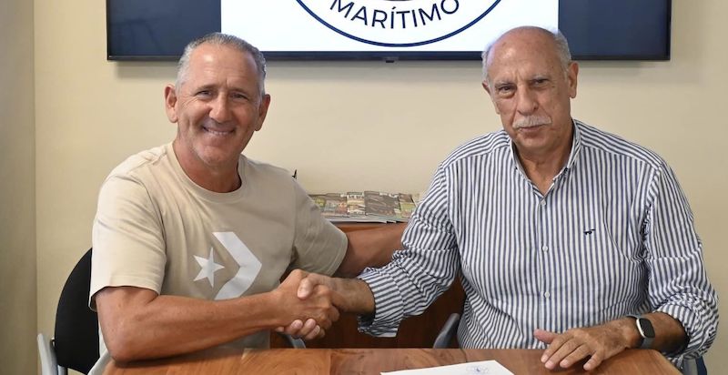 El entrenador algareño llevará las riendas del primer equipo del nuevo club de Cartagena, que militará en la Tercera RFEF tras comprar la plaza del Balsicas Atlético. En la foto se le observa con Miguel Rodríguez, su presidente, y que es pilar de un nuevo proyecto en el que están Isaac Jové (director técnico) y Javier Manzano (director general).
