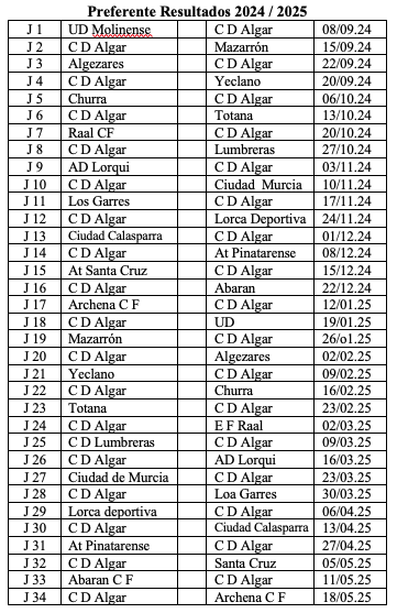 El equipo rojiblanco disputará la primera jornada de la temporada 2024/25 en Preferente visitado a la UD Molinense en Molina de Segura el 8 de septiembre y jugará, una semana más tarde, su primer partido como local contra el Mazarrón. La competición regular concluirá el 18 de mayo de 2025.