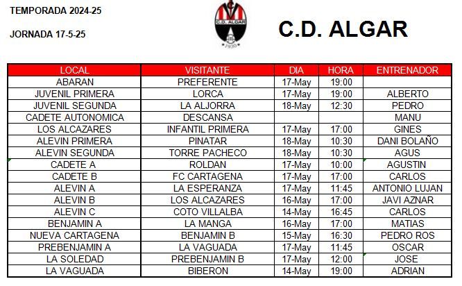Horarios de los partidos que tienen los equipos del Club Baloncesto Sierramar y Club Deportivo Algar de fútbol este fin de semana, además de la AD Algar Surmenor de voleibol femenino, que afronta las fases finales de las categorías cadete, benjamín y alevín, celebrándose la primera de ellas en Fortuna y las otras dos en la ciudad de Murcia.