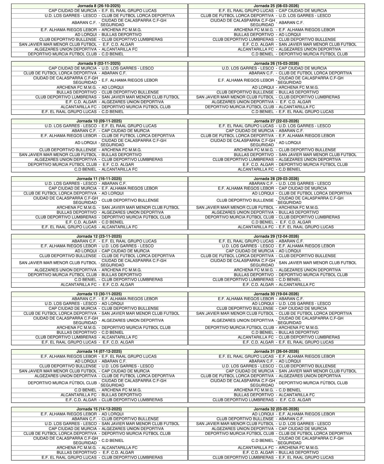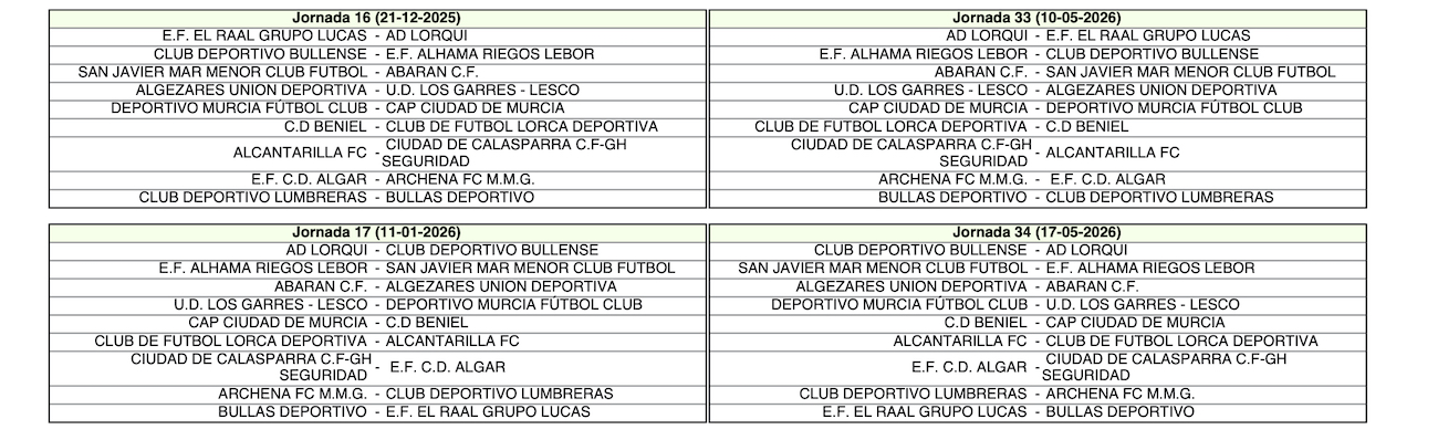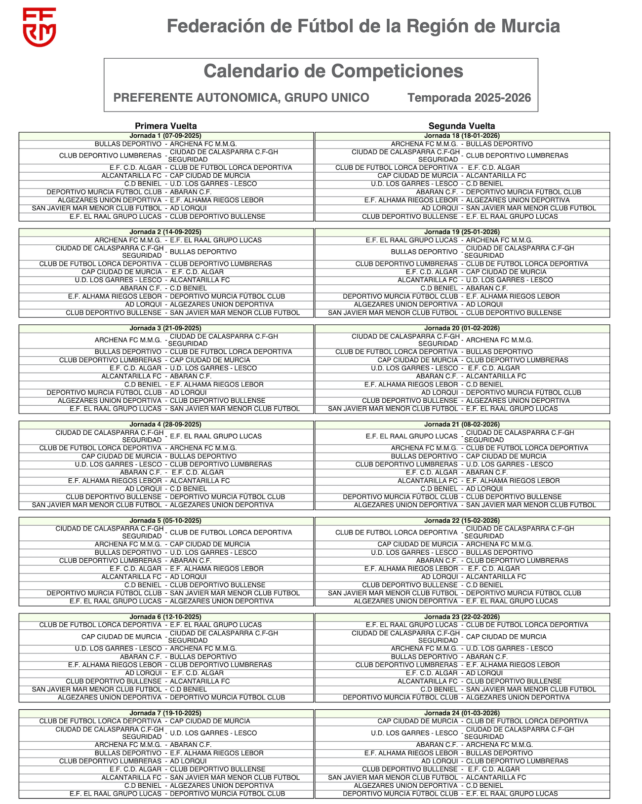 El calendario de la temporada 2025/26 del grupo único Preferente Autonómica ha deparado que el equipo rojiblanco comience la fase regular en el campo Sánchez Luengo en el fin de semana del 7 de septiembre para en la segunda jornada viajar al terreno de juego del CAP Ciudad de Murcia. El final de la competición tendrá lugar el 17 de mayo con el partido como local contra Ciudad de Calasparra.