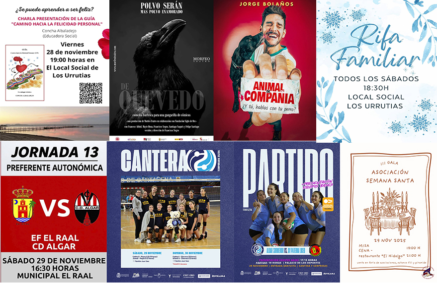 El voleibol es destacado protagonista, hay cuatro partidos de los equipos de cantera de la AD Algar Surmenor en casa y el sábado por la tarde, en Cartagena, tiene lugar la presentación oficial de los equipos de base y el importante partido de la Superliga Femenina. Por su parte, el CD Algar de preferente juegan en San Pedro del Pinatar y tiene compromisos ligueros 15 de sus secciones inferiores. También ofrecemos fechas, horarios y rivales del Club Baloncesto Sierramar. Fuera del deporte hay dos propuestas en el Teatro Circo Apolo y la Agrupación de la Semana Santa celebra su tercera gala. En Los Urrutias hay una charla sobre la felicidad esta tarde y rifa familiar mañana.