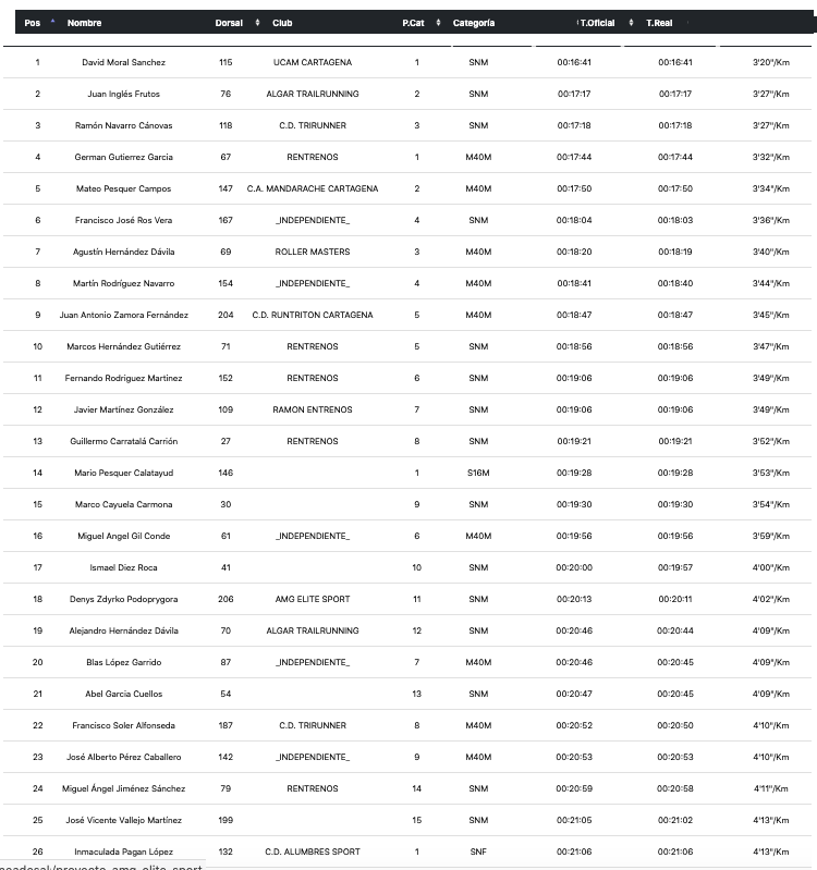 El ganador ha sido el algareño David Moral Sánchez, quien pertenece al equipo del UCAM Cartagena, con un tiempo de 16 minutos y 41 segundos, con ventaja de 36 segundos sobre Juan Inglés Frutos (Club Trail-Running Algar), quien ha superado en un segundo a Ramón Navarro. En féminas, destacar la victoria de Inma Pagán, cartagenera del Alumbres Sport que reside en La Unión. Segunda ha sido Raquel Muñoz Gil, también vecina de La Unión, quien ha cruzado la meta 69 segundos después.