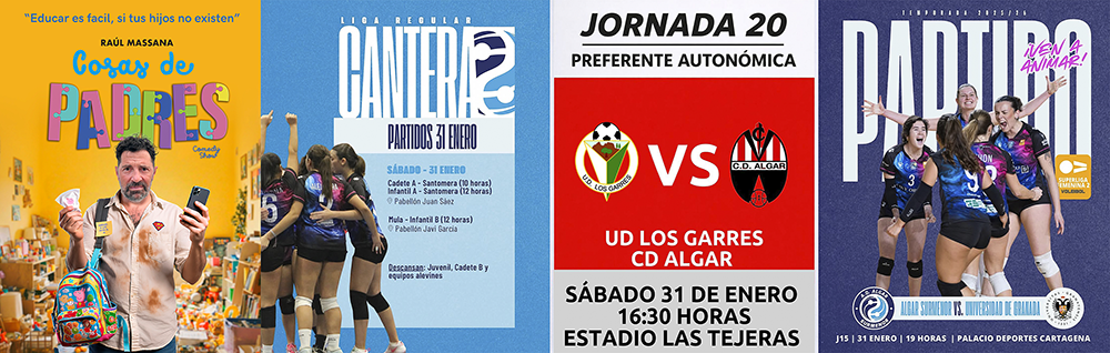 Doble cita crucial para la AD Algar Surmenor, que juega el sábado en Cartagena y el domingo en Granada. También hay partidos de tres equipos femeninos de las bases de voleibol. En fútbol, el CD Algar afronta un partido con valor extra, pues se enfrenta a un rival directo en la lucha por estar en la fase de ascenso. Además, tiene once equipos de cantera en liza. En baloncesto, nuevos partidos para el CD Los Urrutias y el CB Sierramar, club este último que presenta a todos sus equipos el domingo en La Unión. Fuera del deporte, ‘Cosas de padres’ en el Apolo.