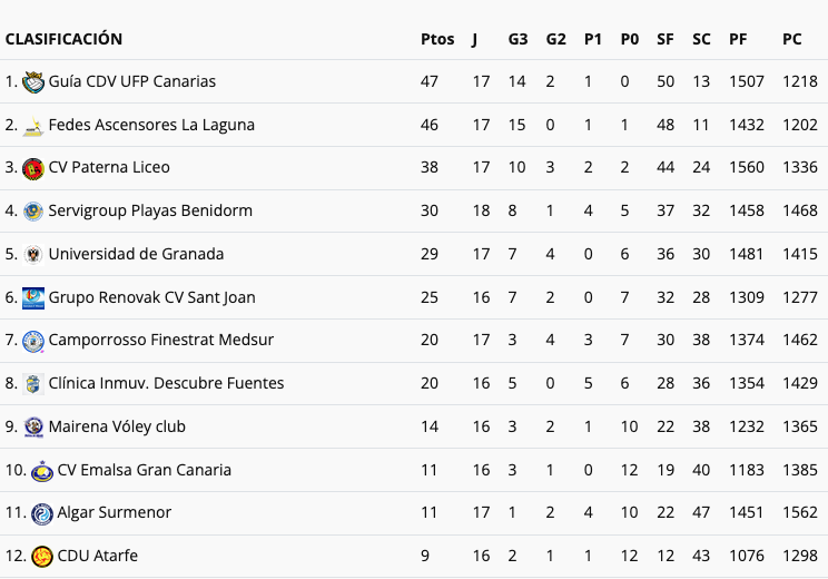 El equipo algareño de la Superliga Femenina 2 de voleibol es superado en la clasificación por Emalsa Gran Canaria, que venció contra pronóstico en la pista del Finestrat alicantino (1-3). Ambos equipos se enfrentan el domingo en la pista auxiliar del Palacio de Deportes de Cartagena, donde las chicas que entrena Riganti tienen que acabar con la racha de no ganar en esa pista desde el 17 de octubre de 2025. Para salvar la categoría, la escuadra de El Algar afrontará los cinco partidos hasta la llegada de la primavera en una recta final con 3 partidos en casa y 2 a domicilio, con duelos directos entre los que luchan por evitar perder la categoría.