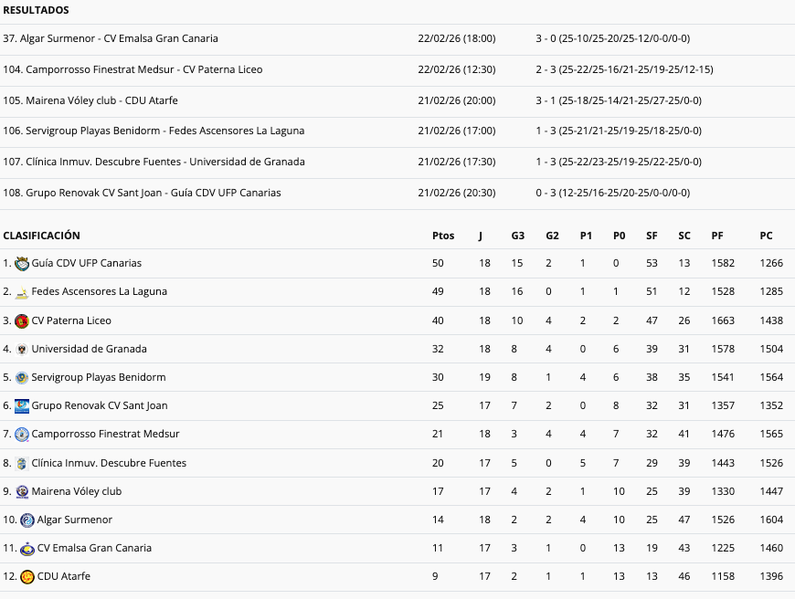 Ahora, en la clasificación, Surmenor lleva 14 puntos como antepenúltimo, ocupando las dos plazas de descenso Emalsa Gran Canaria (11) y CDU Atarfe Granada (9).