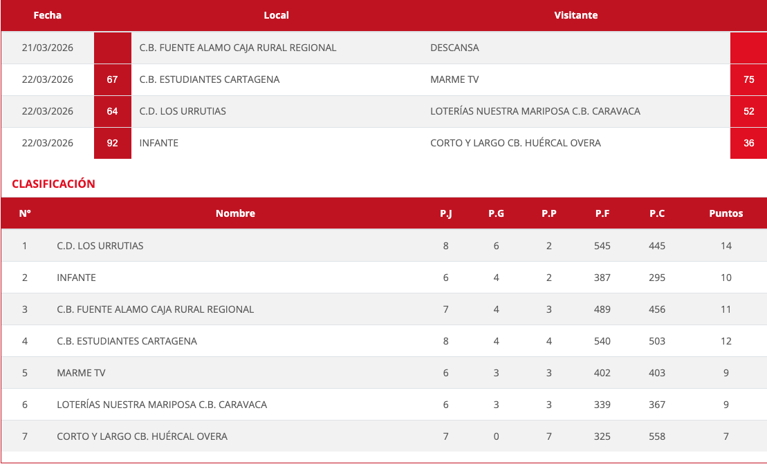 Comenzó CB Caravaca mejor y se puso con 6-9 a favor, pero tras el empate a 11 puntos cogió las riendas del marcador el CD Los Urrutias y ya no lo soltó, consiguiendo en el segundo cuarto despegarse con 30-17 para en el tercer apretarse con el 38-35. En la recta final llegaron las máximas distancias entre ambos con 60-46 y 64-50. Los puntos locales se los repartieron Delgado (20), Solera (13), Iván Fernández (12), Sánchez (6), Raja (5), Carmona (3), Dñiaz 2) y Chema.