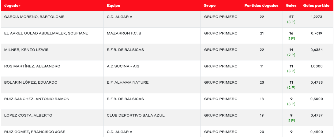 Destacar que Bartolomé García Moreno sigue como claro dominador de la tabla de goleadores de la categoría: