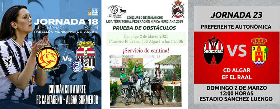 FC Cartagena AD Algar Surmenor intentará prolongar su buen momento en la categoría de plata del voleibol femenino español trayéndose la victoria de la localidad granadina de Atarfe ante un rival que es penúltimo en la clasificación. Por su parte, el CD Algar de fútbol afronta el enésimo intento de frenar su caída en picado. También hay partidos del Club Baloncesto Sierramar y el anuncio de mal tiempo aplaza la jornada de de liga comarcal de fútbol base. La novedad es el primer concurso de enganche para la mañana del domingo.