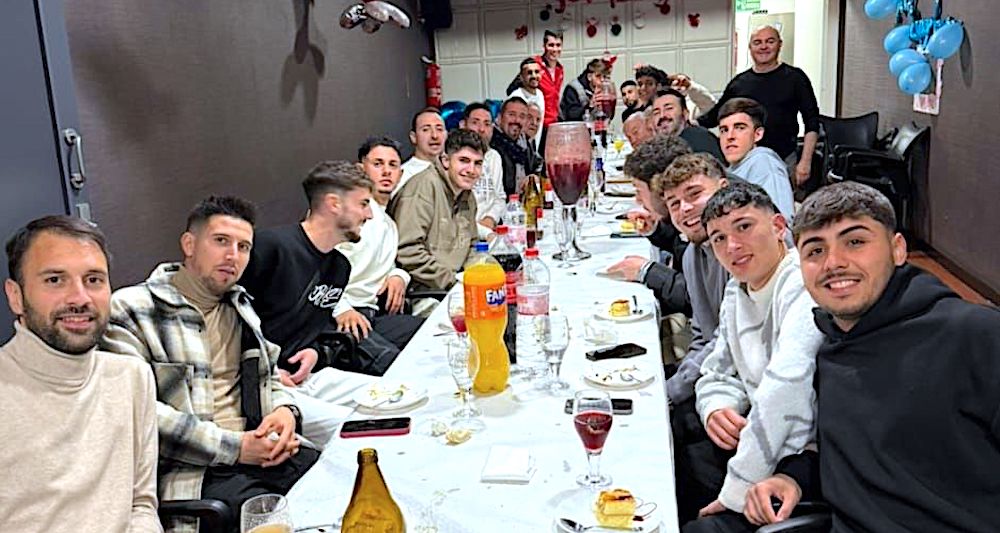 Jugadores, técnicos, empleados y directivos del primer equipo del Club Deportivo Algar celebrando la comida de Navidad en 'El pozo de la hormiga'