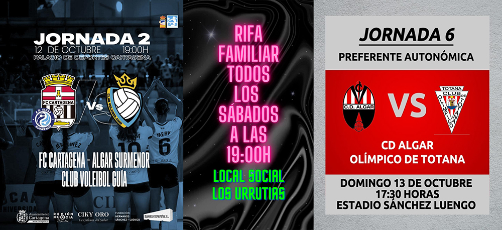 Tras iniciar la liga a domicilio y con victoria, Surmenor se estrena como local recibiendo al CV Guía este sábado en Cartagena. Dentro del voleibol femenino, el infantil viaja a San Pedro del Pinatar. Por su parte, el CD Algar de fútbol recibe a un histórico del fútbol regional. Fuera del deporte, nuevo sábado con bingo en Los Urrutias. En baloncesto hay fin de semana de descanso en las ligas regionales federadas.