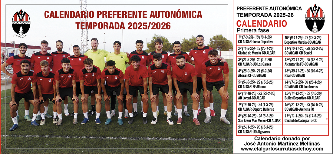 El calendario de la temporada 2025/26 del grupo único Preferente Autonómica ha deparado que el equipo rojiblanco comience la fase regular en el campo Sánchez Luengo en el fin de semana del 7 de septiembre para en la segunda jornada viajar al terreno de juego del CAP Ciudad de Murcia. El final de la competición tendrá lugar el 17 de mayo con el partido como local contra Ciudad de Calasparra.