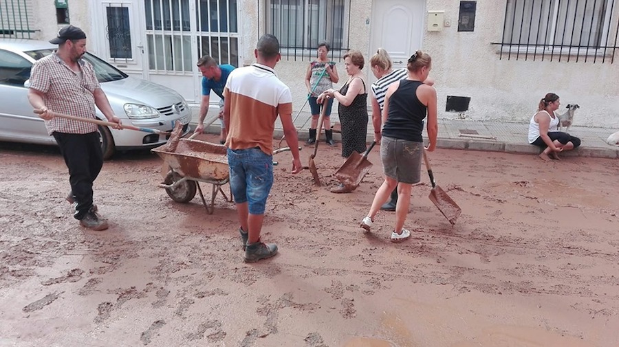 Nancy Ramona Girett Acosta facilita a este diario, a través de redes sociales, imágenes de cómo los vecinos, de muy variadas edades, trabajan para retirar el barro que ha cubierto plenamente el asfalto en El Algar.