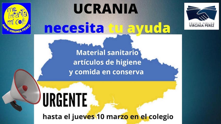 El AMPA y el colegio Virginia Pérez están recogiendo material sanitario, artículos de higiene y alimentos en conserva en las instalaciones del centro hasta este jueves. Este material será enviado para ayudar a los afectados por la invasión de Rusia al pueblo ucraniano.