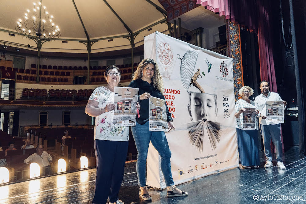 El concejal del área de Cultura, David Martínez Noguera, la edil delegada de Servicios Sociales, Mercedes García junto a la representante de la Asociación Socio Cultural del Teatro Apolo, Cristina Roca y la presidenta de la Asociación Socio Cultural Teatro Circo Apolo, Pilar Sánchez, han presentado esta mañana los detalles del certamen en el Teatro Apolo de El Algar.