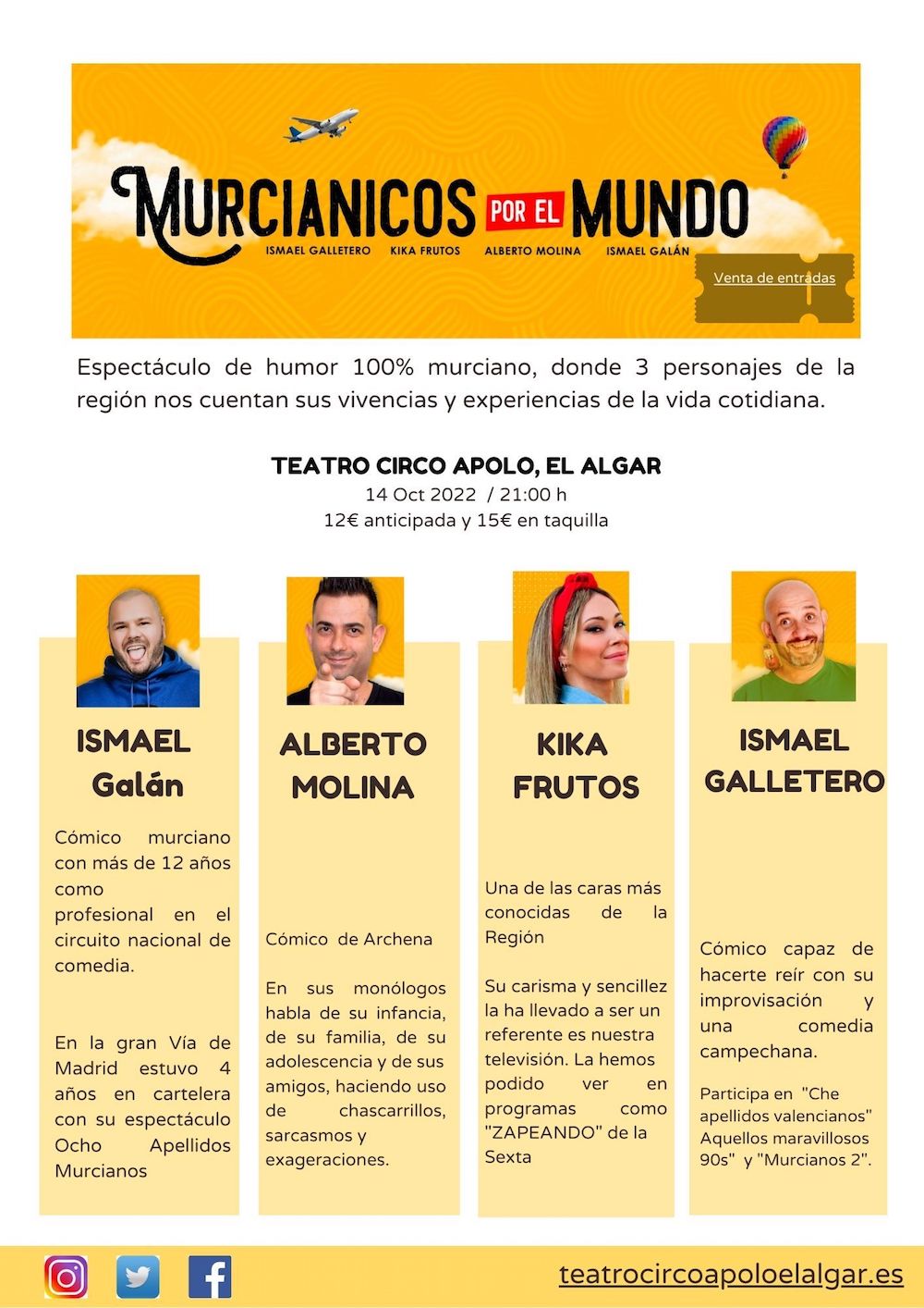 Ismael Galán, Alberto Molina, Kika Frutos e Ismael Galletero protagoniza ‘Murcianicos por el mundo’, que estará sobre el escenario del teatro circo algareño este viernes a las 21 horas. El horario es de 21 a 23 horas y las entradas se pueden adquirir en la página web del Teatro Circo Apolo por 12 euros y, desde las 19 de mañana, en taquilla por 15 euros.
