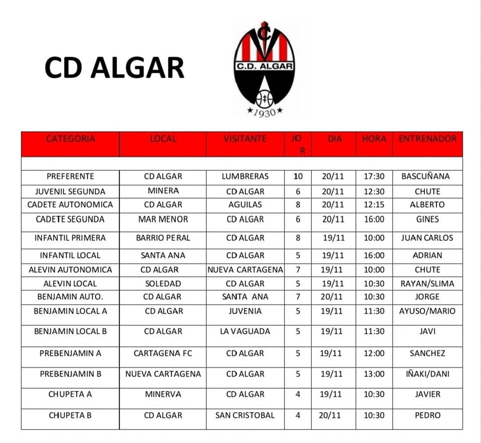 Fechas, horarios y escenarios de los partidos que este fin de semana afrontan los equipos del CD Algar de fútbol, de la AD Algar Surmenor de voleibol femenino y del CB Sierramar de baloncesto. Al margen del deporte, segunda puesta en escena de 'Melocotón en almíbar' a cargo de la compañía Teatro Apolo en su emblemático escenario.