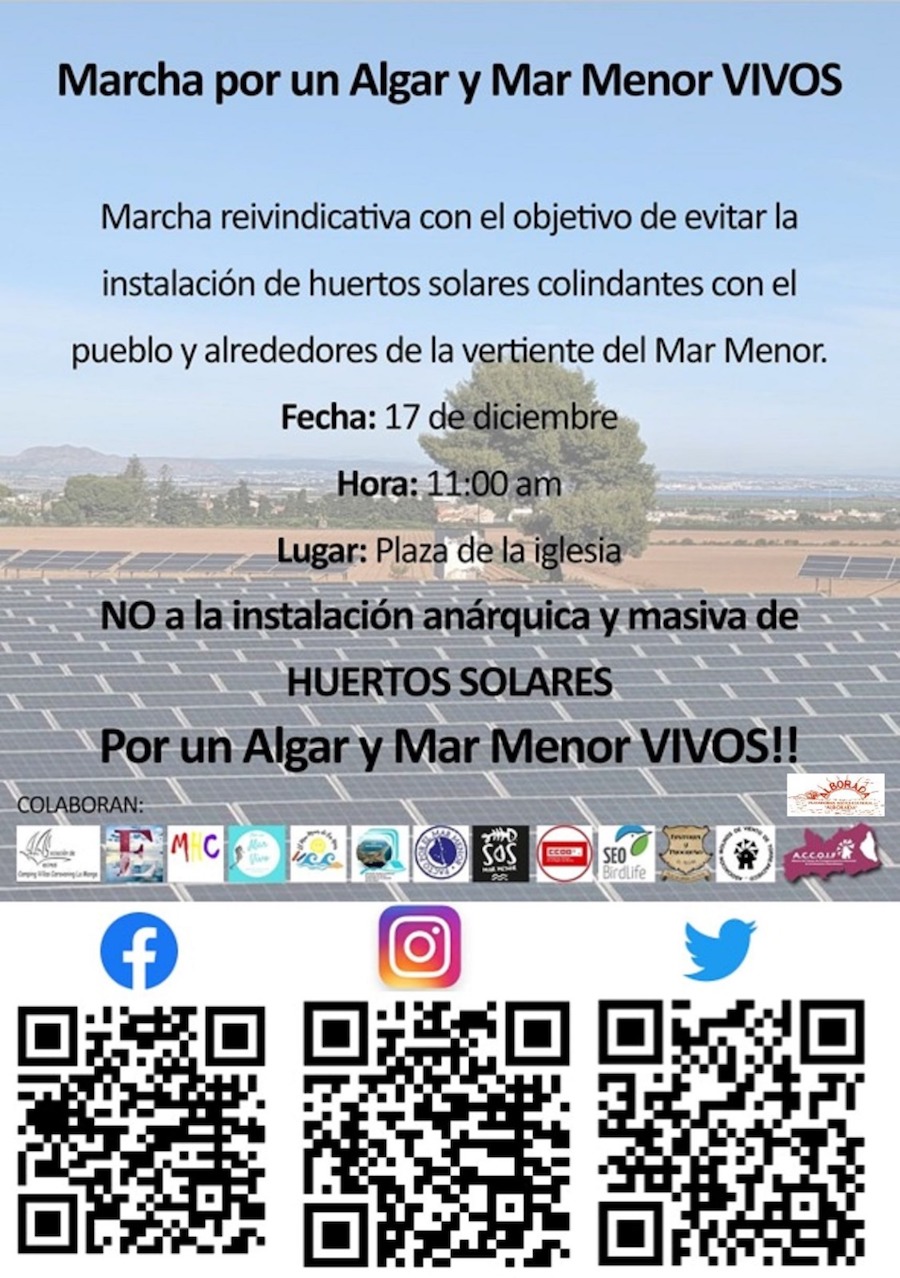 Se ha convocado para el sábado próximo, día 17, a las 11 horas, con inicio de la plaza de la iglesia algareña, “con el objetivo de evitar la instalación de huertos solares colindante con el pueblo y alrededores de la vertiente del Mar Menor”, indican los organizadores.
