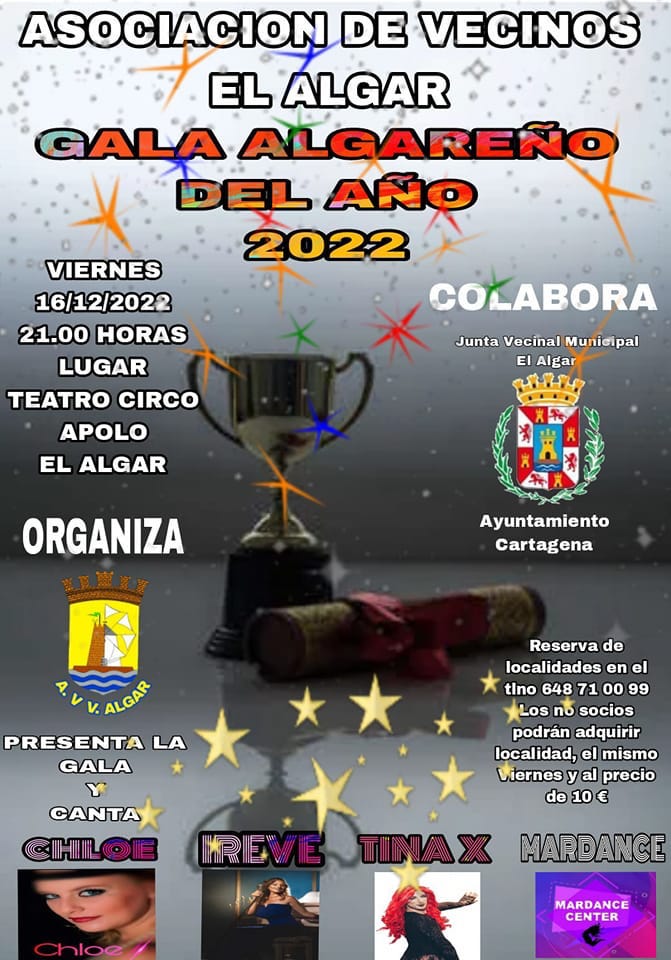 Organizada por la Asociación de Vecinos de El Algar, tendrá lugar en el Teatro Circo Apolo a partir de las 21 horas. Chloe será la presentadora, además de actuar durante la velada, en la que Ireve, Tina X y Mardance Center también pasarán por el escenario. La entrada es gratuita para los socios del colectivo vecinal y deben reservar localidad por teléfono (648 71 00 99). El precio para no asociados es de 10 euros.