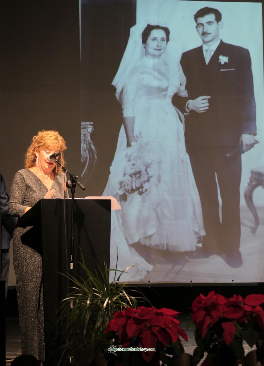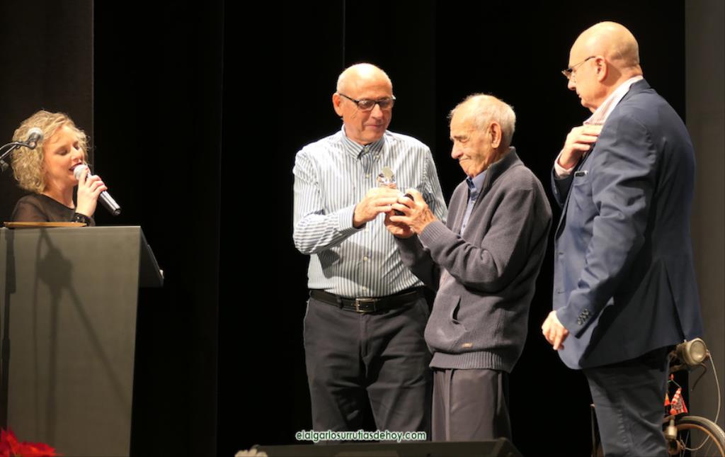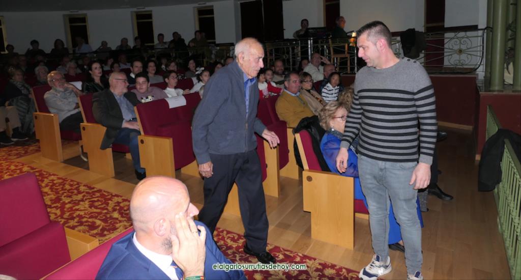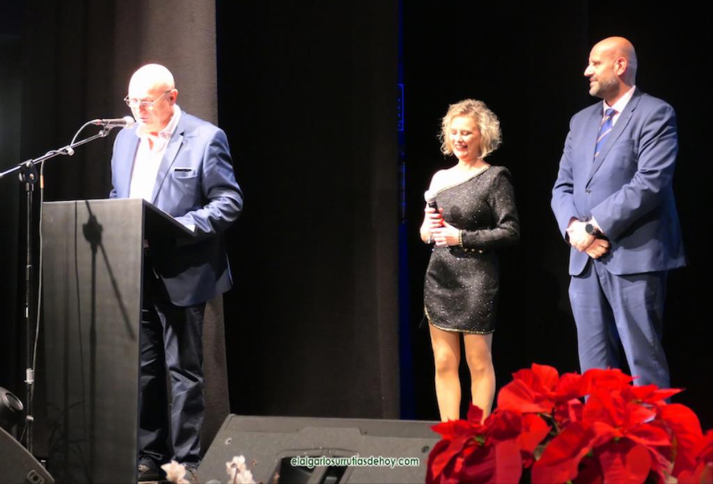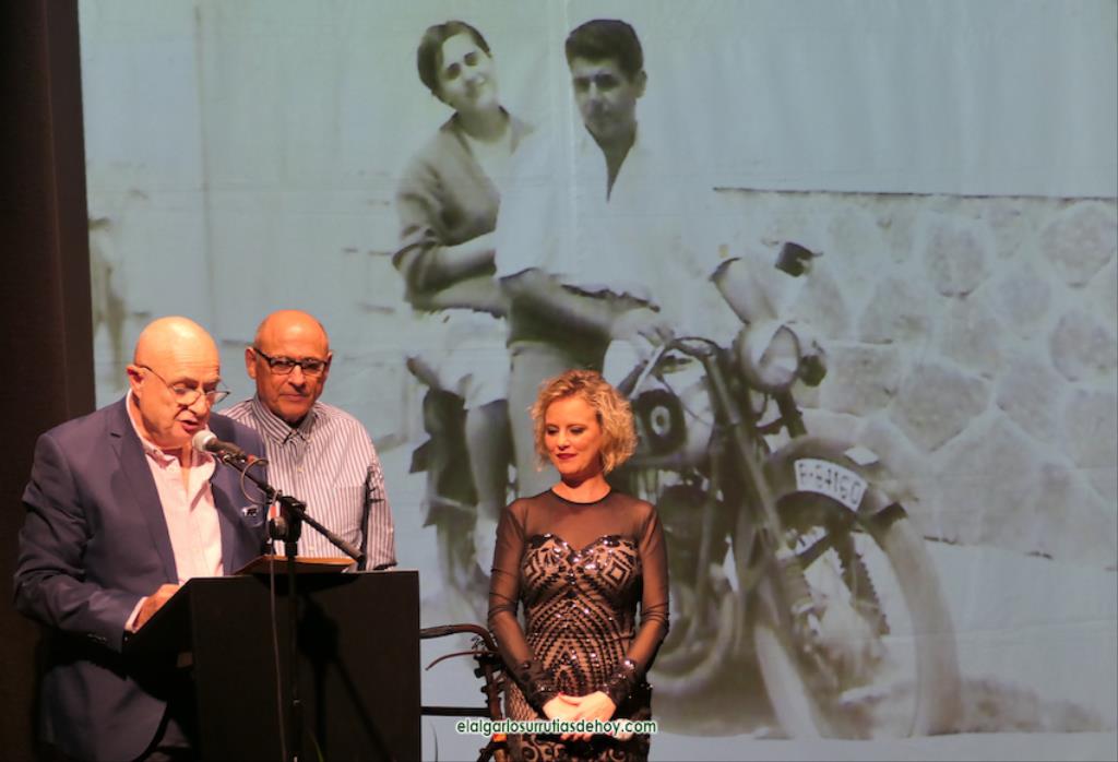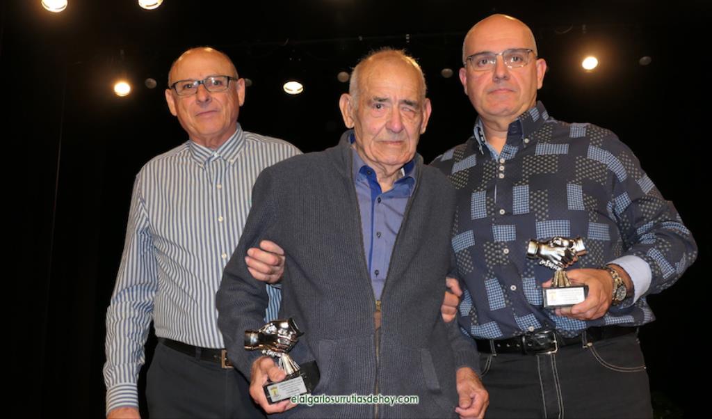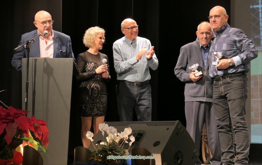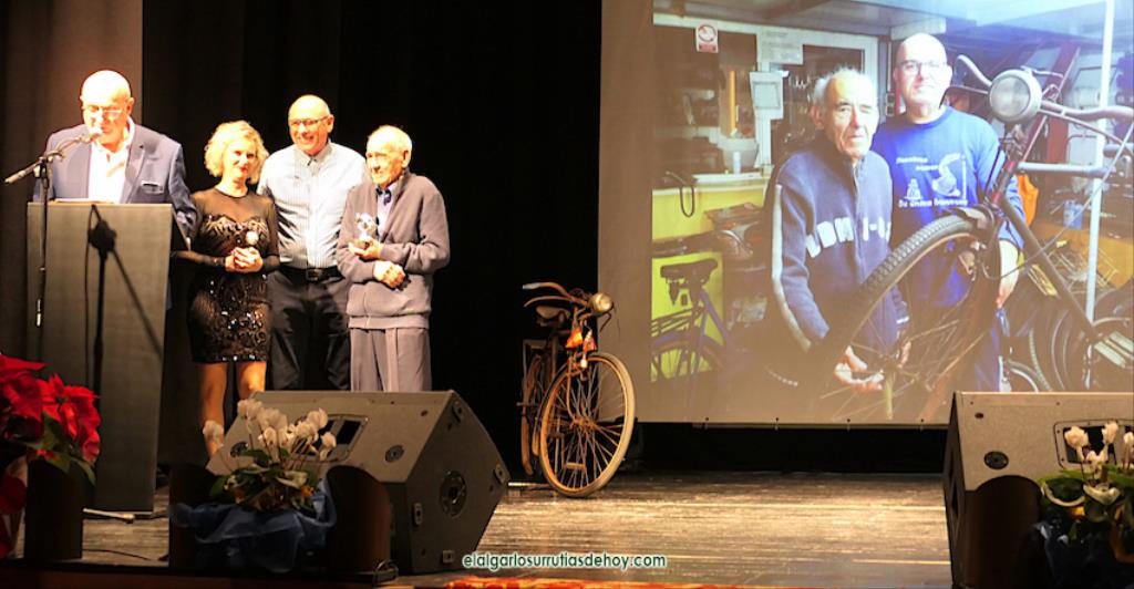 Vayamos a los premios. Pedro García apareció en el escenario sobre una antigua bicicleta para simbolizar el primer destinatario de la noche, que luego resultó doble por extensión. Juan Urrea Martínez lleva apuntado a la asociación de vecinos desde sus inicios, continuando ahora con 85 años de edad. Ha trabajado duro en la minería y en la construcción, para después pasar al taller familiar. Ha disfrutado de la familia y se ha preocupado por su pueblo. Son apuntes de su semblanza, para después subir al escenario, donde no pudo reprimir la emoción cuando recibió, de manos de Ignacio Fernández, vicepresidente vecinal, el trofeo “por su constancia, fidelidad y colaboración altruista con la asociación de vecinos”. No se bajó, pues después subiría su hijo, del mismo nombre, para recoger el galardón auspiciado por la asociación de comerciantes al establecimiento familiar fundado en 1930 de reparación de motos y bicicletas (ahora también de patinetes), por el que han pasado 3 generaciones. Hubo más, pues Juan (hijo) desveló que sus padres cumplen la próxima semana sus bodas de oro, siéndole entregado un gran ramo de flores a la madre por parte de las nuevas generaciones de esta familia.