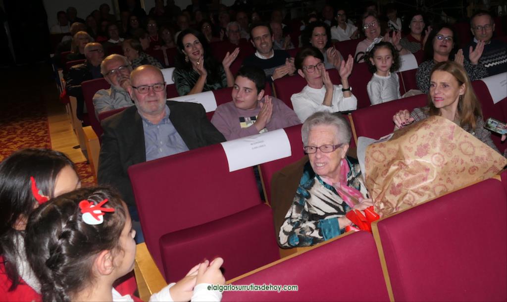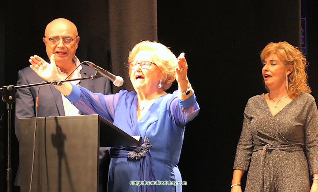 Su labor y compromiso social durante décadas hacia el pueblo la han hecho merecedora del galardón que concede la asociación de vecinos, que también distinguió en una muy agradable gala a Juan Urrea Martínez y a su negocio familiar, a Pedro Esteban García, al Club Deportivo Algar y a la Asociación Socio-Cultural Teatro Circo Apolo. En la imagen se observa a Emilia cantando el himno de El Algar, invitando a todos los vecinos a aprenderlo.