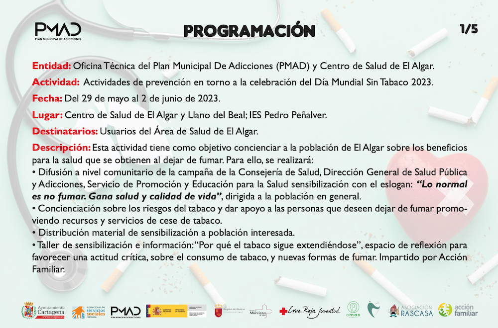 En el marco del Plan Municipal de Adicciones del Ayuntamiento de Cartagena, para conmemorar este día se ha elaborado un programa de actividades de promoción de la salud y prevención del tabaquismo, que se van a llevar a cabo hasta el próximo día 2 de junio en diferentes barrios y diputaciones de Cartagena.
