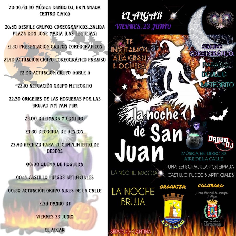 La novedosa fiesta que este próximo día 23, viernes, estrena la Asociación de Vecinos de El Algar comenzará con música de dj a las 20.30 horas en la explanada del centro cívico y después ofrecerá desfiles y actuaciones de grupos coreograáficos, a las brujas 'Pim Pam Pum', queimada con conjuro, recogida de deseos, hechizo, quema de la hogareta, fuegos artificiales y actuaciones de 'Aires de la calle' y de Danbo DJ.