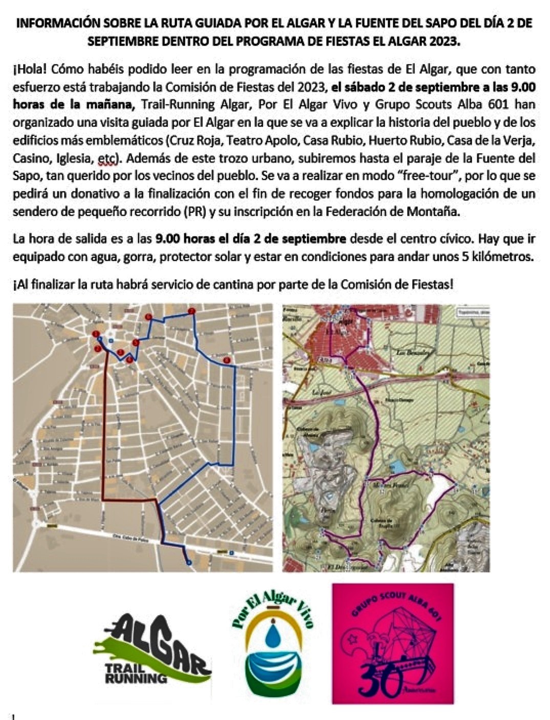 Es otra actividad incluida dentro del programa de fiestas de 2023. Comenzará a las nueve de la mañana del primer sábado del próximo mes en el centro cívico y tendrá unos cinco kilómetros de trayecto que permitirán a los participantes conocer la historia del pueblo y de sus edificios, culminando en el paraje. Organizan 'Trail Running Algar', 'Por El Algar vivo' y grupo scout 'Alba 601', desde donde se trabaja también por la homologación de esta ruta como sendero de pequeño recorrido.