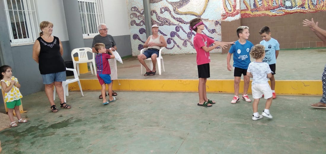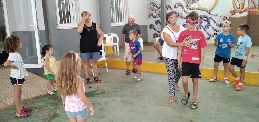 El patio del centro cívico acogió una tarde juegos en los que las personas mayores explicaron a los chavales juegos que practicaban los niños de épocas pasadas, como 'la gallinita ciega' que muestran las fotos adjuntas.