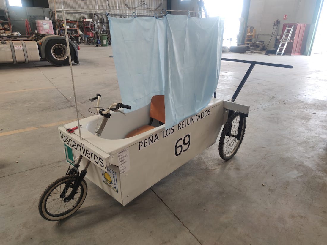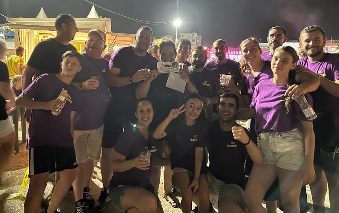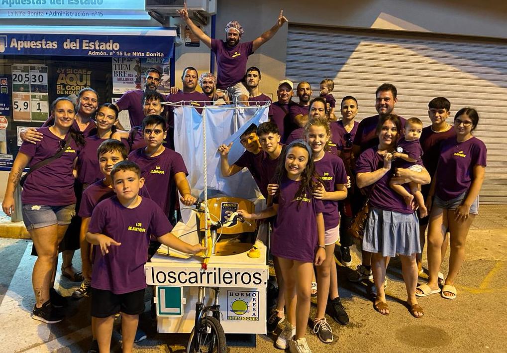 La peña festera, con el singular vehículo que rodean en la fotografía superior, fue la triunfadora del premio de velocidad del concurso de autos locos que se celebró en la avenida de Filipinas dentro de las Fiestas de El Algar.