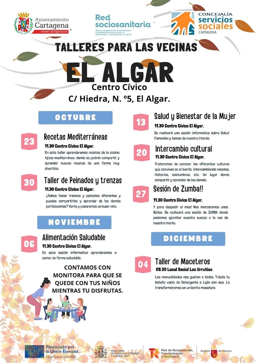 Del 23 de octubre al 4 de diciembre se desarrollarán en el centro cívico de El Algar con diferentes temáticas: recetas mediterráneas, peinados y trenzas, alimentación saludable, salud y bienestar de la mujer, las culturas del pueblo, zumba y elaboración de maceteros.