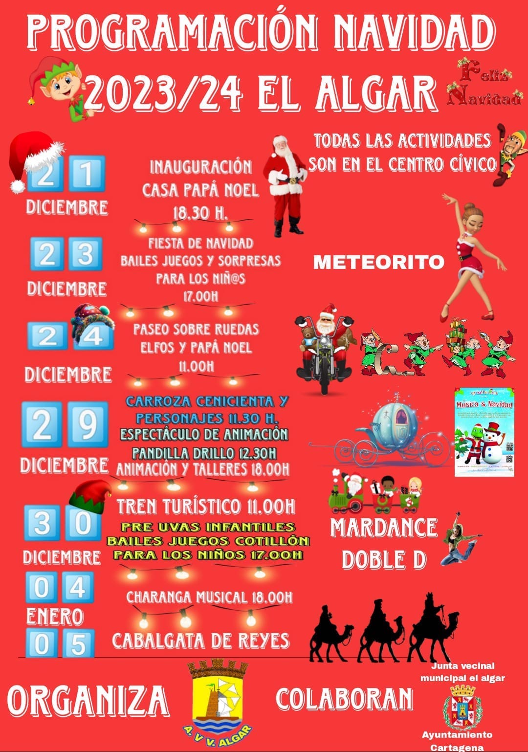 El centro cívico será el epicentro de las actividades, las cuales comenzarán el próximo jueves día 21 con la inauguración de la casa de Papá Noel y culminará el 5 de enero del nuevo año con la cabalgata de Reyes Magos. Entre ambas fechas habrá coreografías, juegos, ruta motera, preuvas infantiles, tren turístico, carroza Disney, charanga...