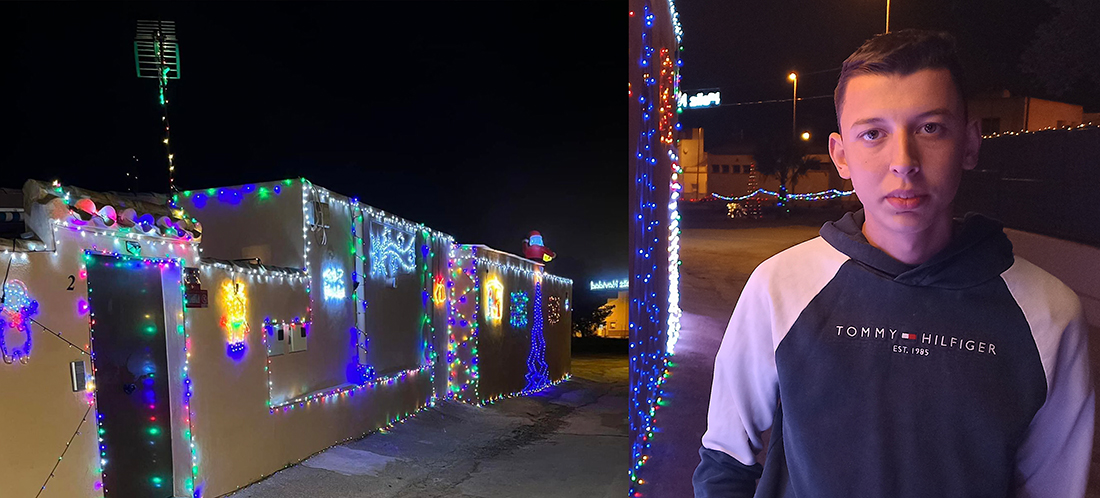 Kike Muiñoz, de 16 años de edad, es un enamorado del espíritu de estas fechas desde bien pequeño y cada año va ampliando el montaje luminoso que rodea su casa, habiendo alcanzado cerca de medio kilómetro de cableado con luces de colores y de imágenes en movimiento, además de instalar como antesala un árbol con dos renos.