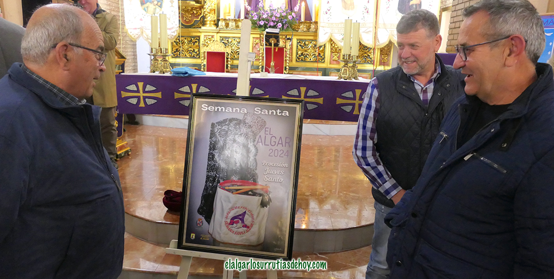 El cartel fue descubierto ante los presentes en la iglesia de Nuestra Señora de los Llanos por los presidentes de la Junta Vecinal Municipal y de la Asociación de Vecinos, respectivamente, Salvador García y Pedro García, este último, a la sazón, pregonero de la Semana Santa de El Algar'24.