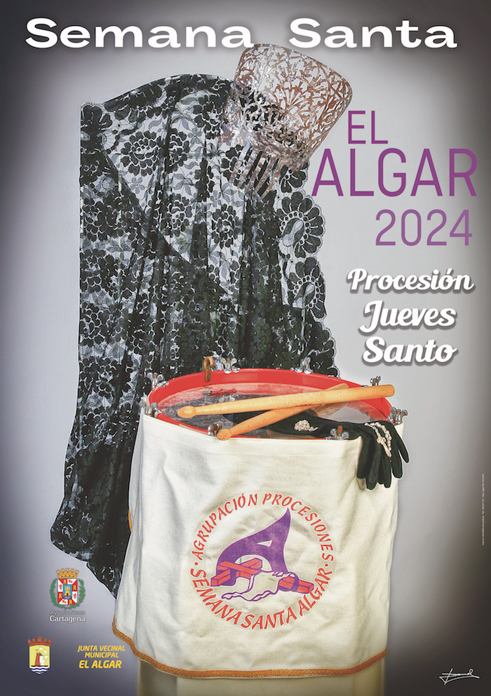 El cartel de la Semana Santa de El Algar ha experimentado este año un nuevo concepto, pues las imágenes de Jesús Nazareno, Cristo Crucificado y Virgen de la Caridad, que se alternaban en la imagen oficial, son aparcadas para mostrar una nueva simbología de la procesión algareña. "He querido ofrece algo distinto y hacer un homenaje a las 'manolas' y a los que marcan el ritmo de la procesión", explicaba a este periódico Susana Español de Lario, cuyo cartel ha sorprendido de forma muy agradable.
