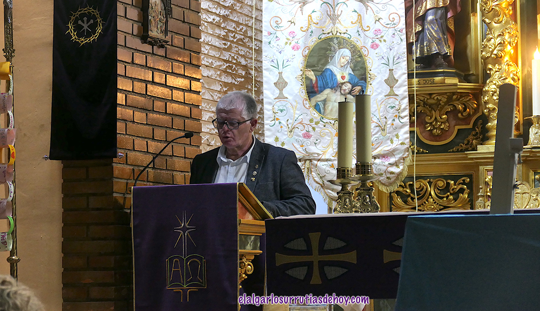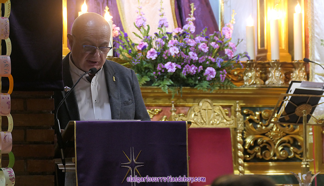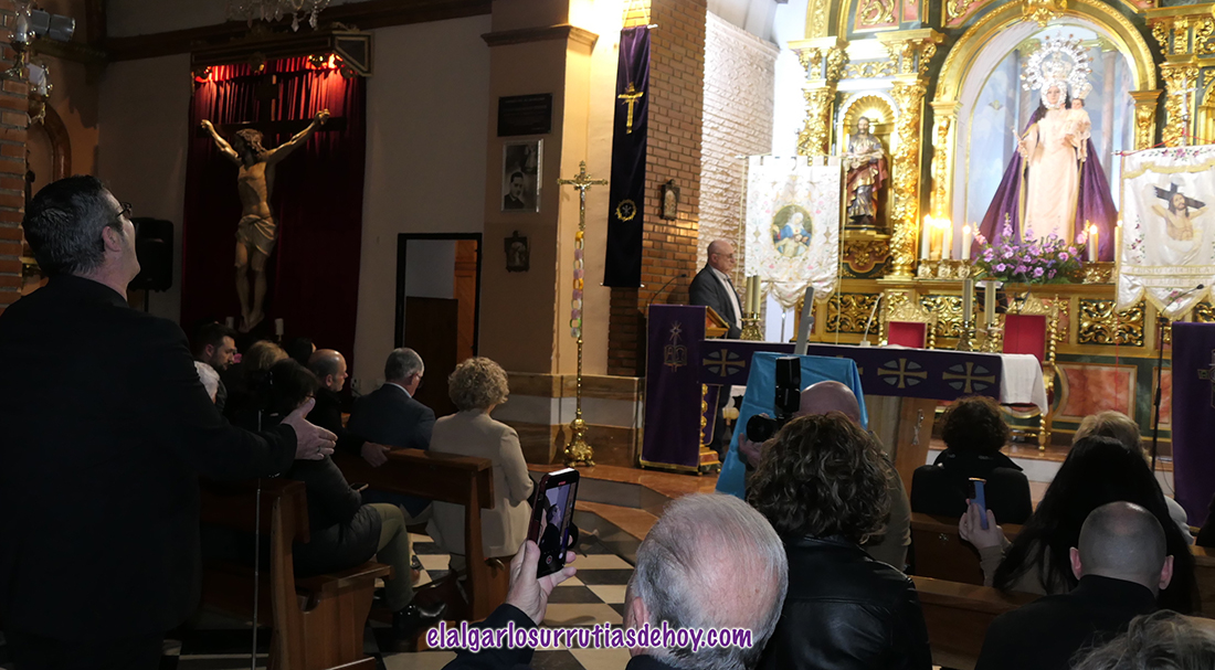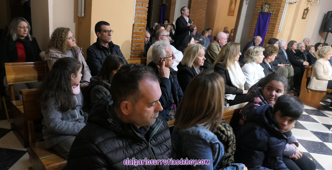 La iglesia de Nuestra Señora de los Llanos acogió el principal acto de cuaresma de la Agrupación de la Semana Santa de El Algar, en la que Anastasio Guerrero, como presidente, comenzó la presentación elogiando "la dinámica labor" que está llevando a cabo en el pueblo el sacerdote Antonio Guillén, quien estuvo entre los asistentes, al igual que la edil algareño Paqui Martínez Sotomayor y el presidente de la Junta Vecinal Municipal, Salvador García Paterna, además de varios representantes de colectivos algareños.