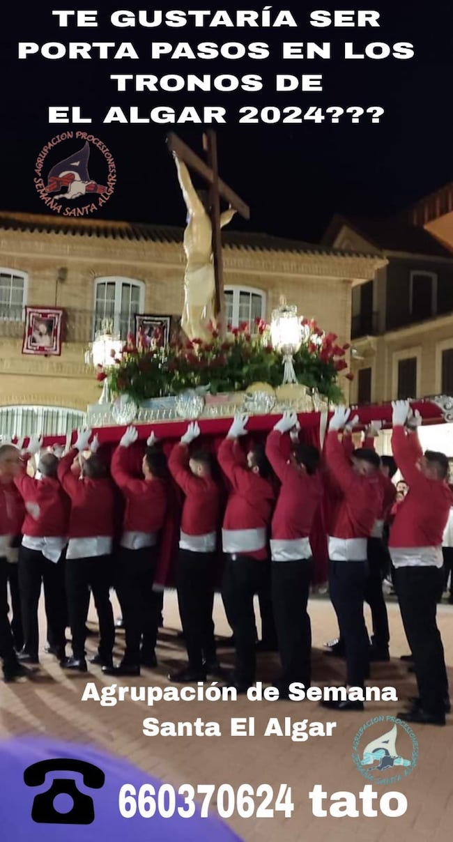 La Agrupación de la Semana Santa de El Algar hace un llamamiento ante la falta de costaleros para sacar a hombros a Jesus Nazareno y a Cristo Crucificado en la procesión del Jueves Santo. Se admiten personas de ambos sexos, matiza el presidente, Anastasio Guerrero, quien también pide que se extienda este llamamiento para conseguir cubrir el cupo en pos de "no perder nuestras tradiciones".