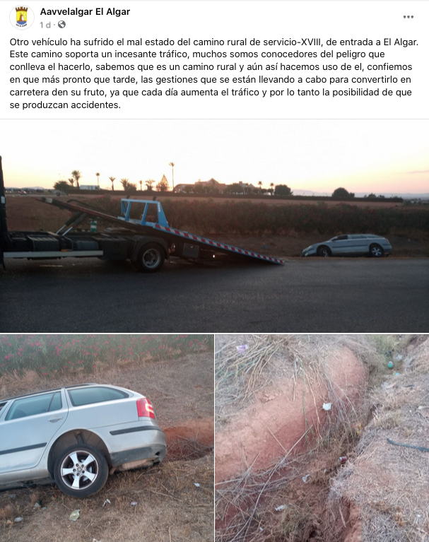 La asociación de vecinos publica en sus redes sociales un nuevo accidente que ha tenido lugar en el camino rural de entrada a El Algar, expresando el deseo de que, debido al alto volumen de circulación que acoge, se convierta pronto en carretera oficial con sus correspondientes medidas de seguridad.